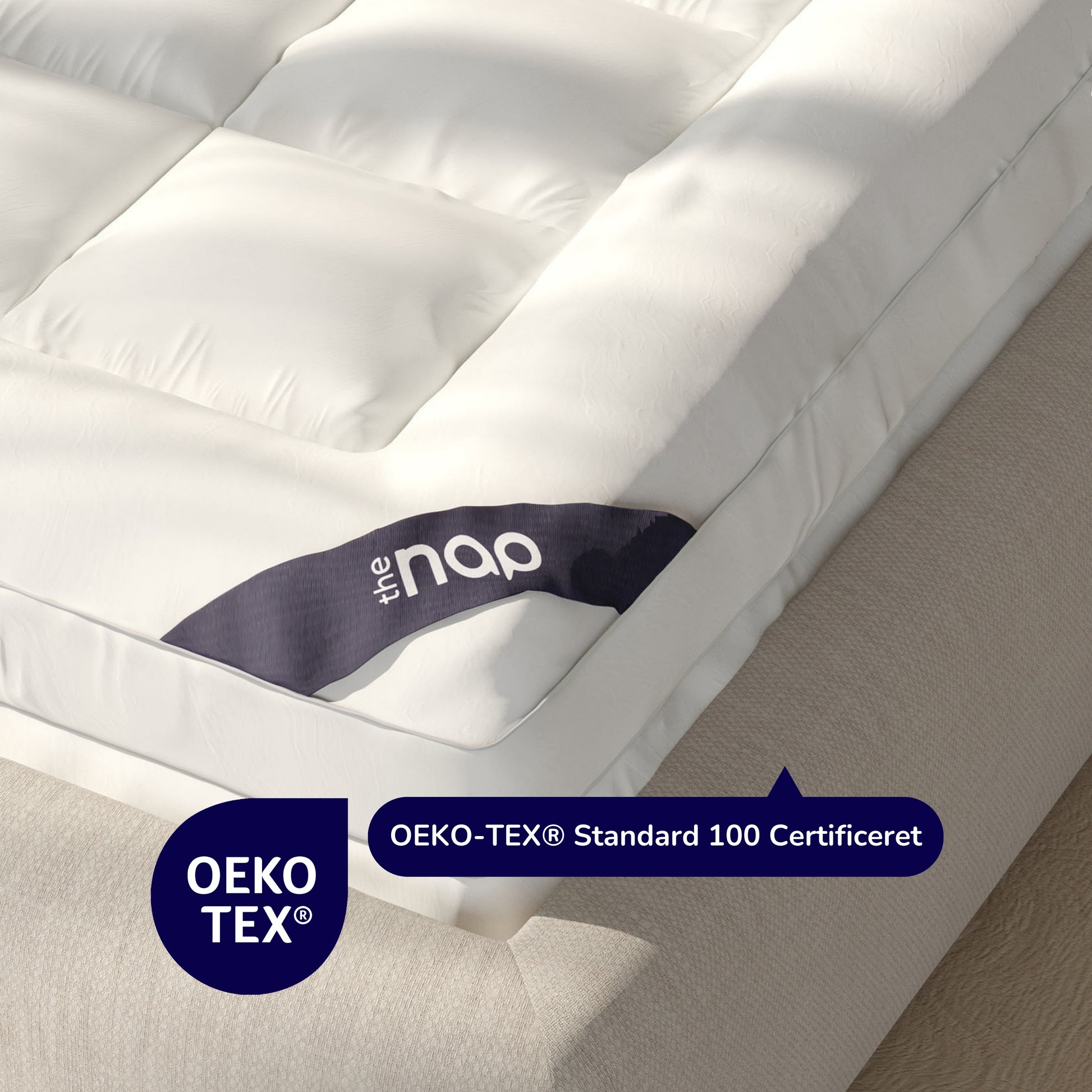 NapTopper™ er designet til at bevare sin form og blødhed over tid. Med OEKO-TEX® certificeringen kan du være sikker på, at materialerne er fri for skadelige stoffer og sikrer et sundt sovemiljø